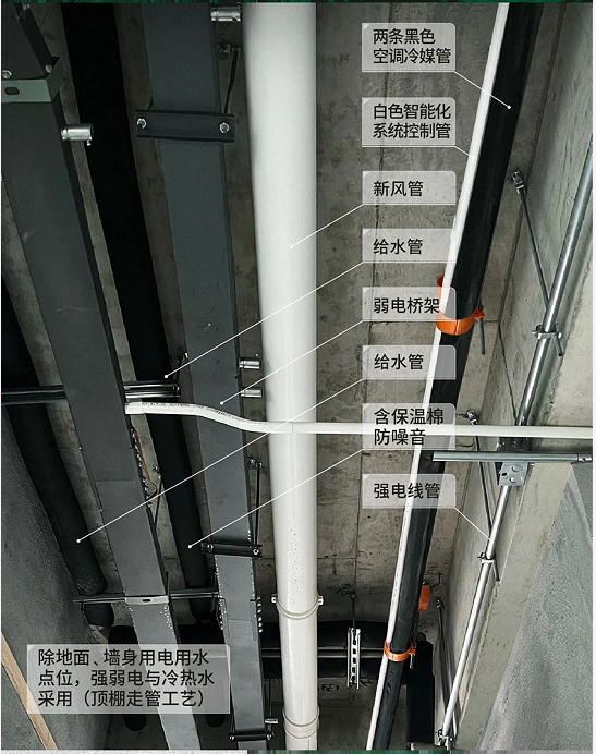 四大天花配管系统,集聚360度智能化系统,高端净水设备供水系统,智能新风除霾系统,健康变频节能高端一线品牌的暖通系统于天花走线,可以让业主除去后期撬开地板维修的困扰。