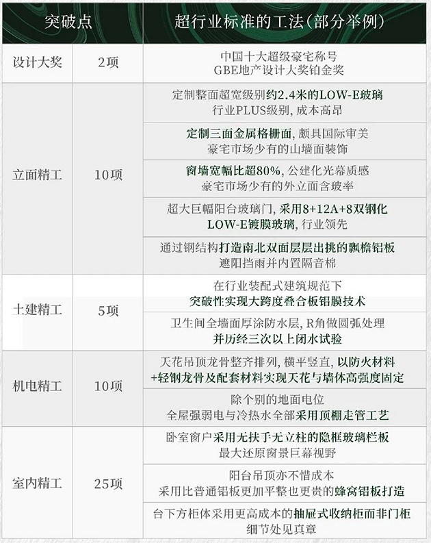 在建造过程中,合景臻颐府以52项精工领先行业标准,其中荣获2项世界级设计大奖。10项行业领先的立面精工,5项突破性的土建精工,10项机电精工,25项室内精工,贯穿项目全周期,以严格的标准,努力保交付,促进度,树品质。