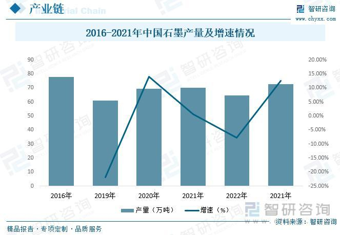 中国石墨矿床主要分布于华北地块、扬子地块周缘、天山—兴蒙造山带和秦祁昆造山带,石墨矿产地分布广泛,矿石种类齐全,以晶质石墨为主,隐晶质石墨为次,而储量又相对集中于少数成矿最有利的地区。其中2021年中国石墨产量为73.5万吨,同比增长13.1%。