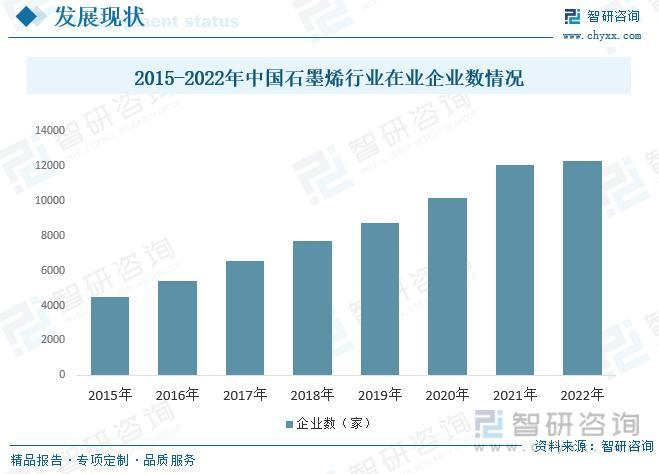随着“中国制造2025”国家战略的出台,石墨烯扶持力度加码,国家、地方政府、产业联盟通过多种手段支持石墨烯产业发展。“中国制造2025石墨烯产业技术路线图,明确了产业化发展重点、方向和路径,已解决当前相关产品制备技术存在成本高、技术不成熟、产品不稳定等问题,开发针对特定场合的多形态和特性石墨烯材料的制备和结构调控技术。当下,中国石墨烯行业整体发展形势良好。在企业数量方面,我国石墨烯产业在业企业数从2013年的3339家增长至2022年的12268家。
