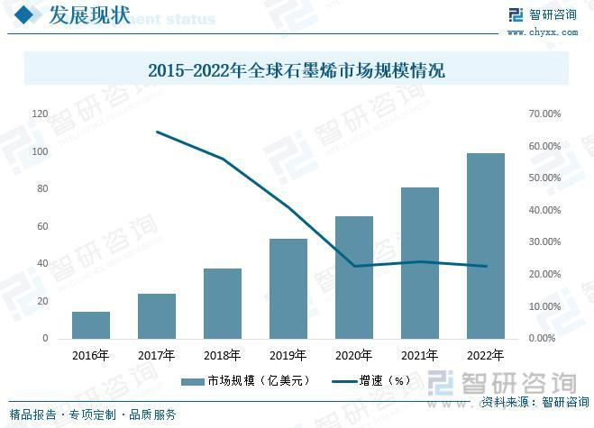 随着全球石墨烯研发成果陆续进入市场,全球石墨烯市场规模开始快速扩张,尤其在涂料、消费电子以及新能源能源,石墨烯需求大幅增长,进一步带动了全球石墨烯的市场规模,截至2022年全球石墨烯行业市场规模约99.39亿美元,同比增长22.52%,2016年到2022年市场规模增长了84.66亿美元,复合增长率为37.46%,保持着快速增长的态势。