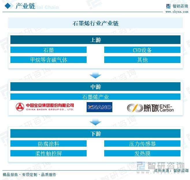 中国石墨烯行业上游是石墨烯原材料供应行业;中游是石墨烯生产行业;行业下游为石墨烯主要应用行业,主要包括储能材料行业、防腐涂料行业、压力传感器行业、柔性触控屏行业和发热膜行业等。