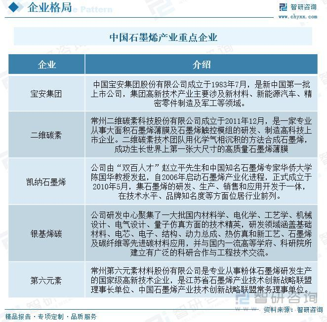 现阶段,各国的支持政策大多集中在石墨烯中游产业链上,欧美等发达国家前期支持政策主要集中于石墨烯基础研究和高端应用产品开发。而未来,随着石墨烯产业化进程的加快及其展现市场价值的飙升,各国政府将进一步加大对石墨烯下游应用的政策支持,推动石墨烯产业化发展。可以预见,随着石墨烯制备技术的逐步成熟和应用研发的逐步扩展,在各国政府和企业的大力推动下,研发成果转化与产业化将发展迅速。目前中国石墨烯产业重点企业有中国宝安集团股份有限公司、常州二维碳素科技股份有限公司、厦门凯纳石墨烯技术股份有限公司、银基烯碳新材料集团股份有限公司、常州第六元素材料科技股份有限公司等。