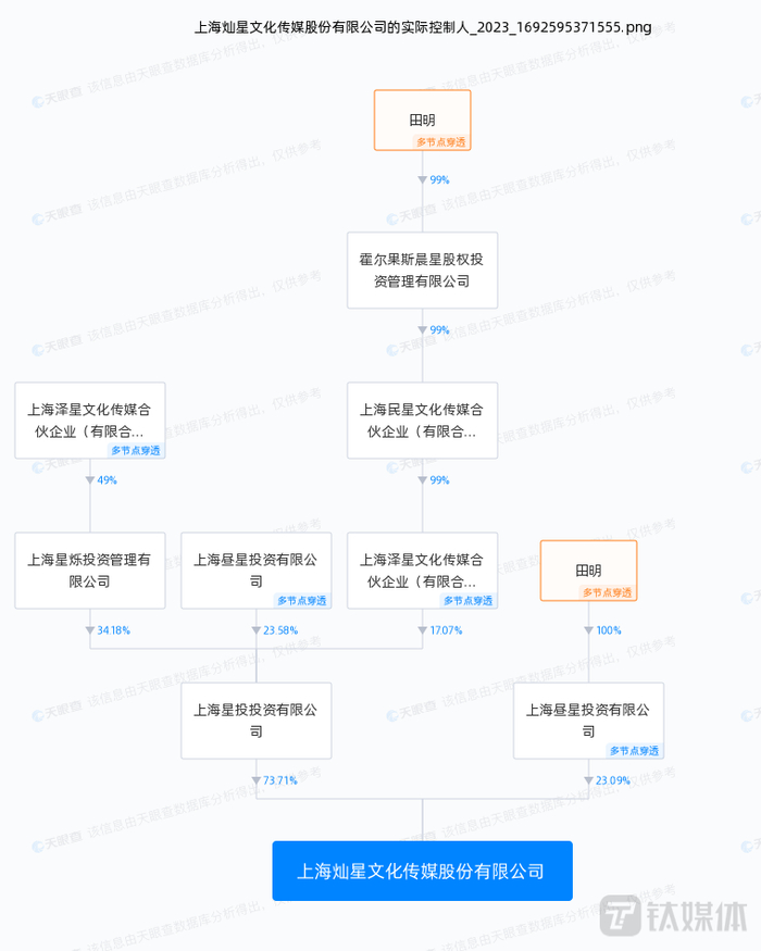 另据天眼查信息显示,在经过多层股权穿透后,当前灿星文化背后的实控人直指田明。