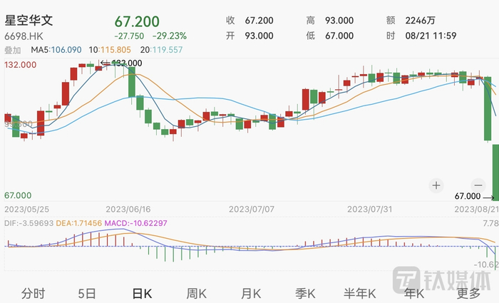 钛媒体APP注意到,上市当日,星空华文的发行价为26.5港元,到了今年2月初已实现累计涨幅近240%,并在6月一度涨至132港元的高点,市值突破520亿港元,但随后公司股价开始不断下跌。
