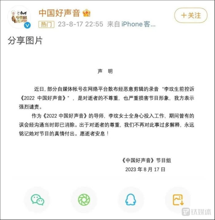 当天晚上,《中国好声音》节目组在微博发布声明进行回应,称当前在网络平台散布的录音为“自媒体账号恶意剪辑”,并提到在与李玟合作期间曾经有过的误会,但当时已经沟通并消除误会,“出于对逝者的尊重,我们不再对此事过多解释,永远铭记她对节目的真情付出。”
