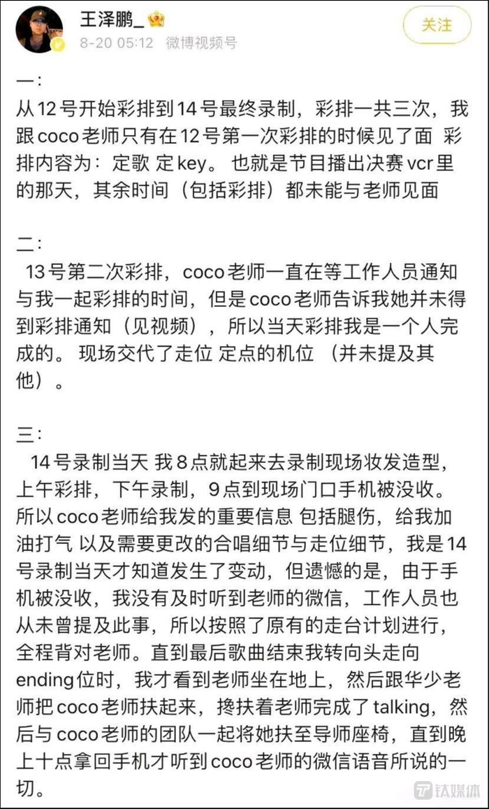 据王泽鹏晒出的聊天记录,印证了此前李玟对节目组的控诉:李玟因腿伤而提出要王泽鹏站在身边扶着自己,但节目组并没实现这个安排;李玟在演出过程中摔倒,节目组却不喊停。