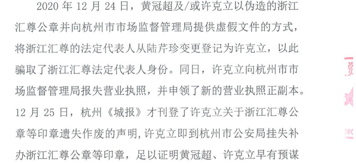 本案中黄冠超伪造浙江汇尊的公章,提供虚假担保,存在利用假公章进行巨额经济诈骗的刑事犯罪的事实。2021年1月18日,黄冠超又名黄志群,利用前海健康(00911)拥有众安汇尊的51%股权作为引诱,通过伪造的虚假公章签署诈骗协议,骗取众多受害人的巨额资金。根据第五被申请人(浙江汇尊投资管理有限公司)在仲裁庭和深圳市中级人民法院提供书面证据,以下是浙江汇尊公司出示的黄冠超涉嫌伪造公章的盖章文件。