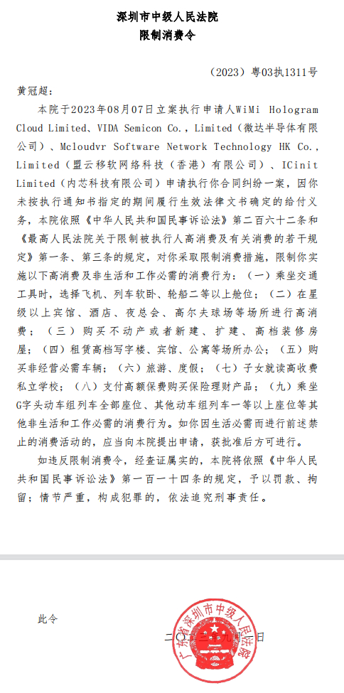 鉴于2023年7月19日,深圳国际仲裁院对黄冠超(新改名为黄志群)及其相关的拓陞有限公司、海達匯有限公司、享偉有限公司及浙江汇尊投资管理有限公司等被申请人拖欠巨额货款一案做出终局裁决:黄冠超(新改名为黄志群)及其实控的拓升有限公司、海达汇有限公司、亨伟有限公司等四被申请人共同承担清偿拖欠货款9,964,627.745美元,赔付违约金1284765.369美金。此外,共同支付仲裁费用、律师费、保全费等费用人民币1,311,3430.22元、港币46,400.00元。以上确定的各项应付款项,第一被申请人(黄冠超新改名黄志群)、第二被申请人(拓陞)、第三被申请人(海達匯)、第四被申请人(享偉)应在本裁决作出之日起十五(15)日内支付完毕。面对深圳国际仲裁院的终局裁决,黄冠超(新改名为黄志群)拒绝履行法律文书。众多受害人已经向深圳市中级法院申请强制执行。
