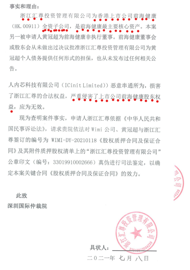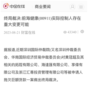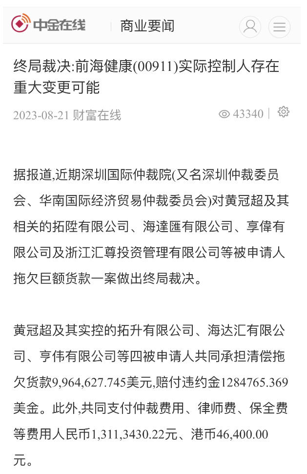 据报道,近期众多受害人针对 深圳国际 仲裁院对黄冠超(新改名为黄志群)及其相关的拓陞有限公司、海達匯有限公司、享偉有限公司的终局裁决约8900万港元没有履行法律文书,已经向深圳市中级法院申请强制执行。按照有关香港大湾区法律合作框架,深圳有关法律文件会在香港同步执行,届时 前海健康 的实控权将会依法强制发生变化。按照终局裁决必须执行的约8900万港元,即便是黄冠超以及海达汇、亨伟及拓陞控制前海健康52.72%的股权按照仲裁要求执行完毕后,仍然存在四千余万港元的债务缺口。