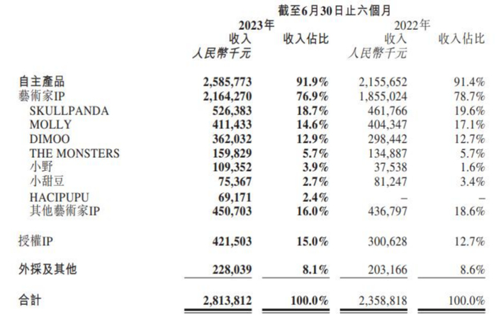财报显示,SKULLPANDA、MOLLY和DIMOO在上半年分别实现收入5.26亿元、4.11亿元和3.62亿元,同比分别增长14.0%、1.8%和21.3%。 可以看出,经典IP依然是中坚力量,上述三款经典IP营收占46%。