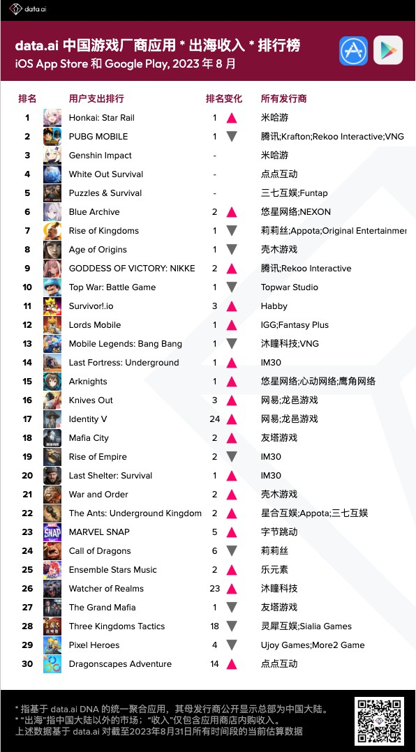 智通财经APP获悉,9月11日,据data.ai,2023年8月中国游戏厂商及应用出海收入排行榜出炉,米哈游、腾讯(00700)海外创收成功超过1亿美元,点点互动超越三七互娱(002555.SZ)来到收入榜单第3位。除White Out Survival(寒霜启示录)全球收入快速增长以外,点点互动另一款农场模拟游戏Dragonscapes Adventure(飞龙岛历险记)在欧美市场表现不俗,帮助发行商月度营收增长13%。其余排名上升明显的游戏厂商还包括悠星网络、Habby、星合互娱、乐元素、天游网络以及心动网络。