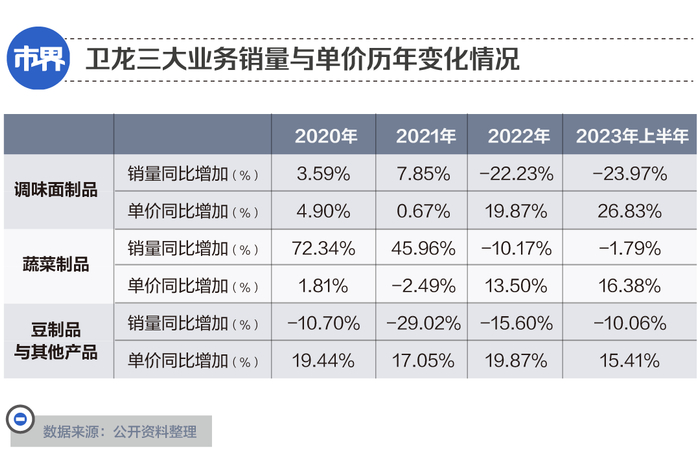 从数据来看,近几年,卫龙三个板块确实都在大幅涨价。较2019年,三大板块每千克平均单价分别上涨了45%、24%和84%,其中,豆制品及其他产品板块涨幅最大,接近翻倍。不过单看2023年上半年,调味面制品板块涨幅最大,同比增加了27%,甚至跑赢了LV热门包款每年10%—20%的涨幅。对于价格上涨,卫龙在半年报中表示,是因为调整了产品结构,淘汰了部分低价格的产品。不过深入研究卫龙涨价的背后,可以发现其涨价的逻辑,以及其触及天花板后的无奈。近几年,伴随卫龙不断涨价的,是其三个板块产品的销售数量的大幅减少,而且销量下降越多,涨价幅度越大。豆制品与其他产品板块从2019年起销量就在逐年下降,因此这几年涨价幅度最多。而调味面制品与蔬菜制品两大板块的产品销售均价,其实长期保持较稳定的价格,直到2022年销量开始下降时,涨价也同时发生了。其中,调味面制品今年上半年少卖近2万吨,加上2022年上半年和下半年分别少卖的1.3万吨与1.7万吨,一年半合计少卖6万吨,销量降幅最大,涨价幅度也最高,且越来越大。