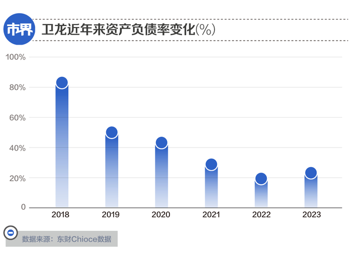虽然在营收上,卫龙似乎触及了天花板,多年营收徘徊在48亿元左右,但也不可否认,辣条确实很赚钱。根据弗若斯特沙利文的资料,2021年中国休闲食品行业平均净利率为10%左右,而卫龙净利率多年超过17%。因此,卫龙账面资金很充足。截至2023年6月底,卫龙现金及现金等价物、交易性金融资产分别为7.74亿元与2.06亿元,初始期限为三个月以上的定期存款(一年内)为18亿元,一年以上定期存款21.3亿元,四类“真金白银”合计达到49.12亿元,占总资产的比例达到67.78%。即便刨除2022年卫龙通过IPO所获得的8亿元募资净额外,其资产占比也达到了57%。要知道,卫龙目前的总负债不过17.22亿元,且没有有息借款,仅一年内到期的定期存款,就可以覆盖。自卫龙披露数据以来,其资产负债率就呈现下滑趋势,从2018年的84.2%,降至2022年的20.29%,今年上半年,这个数字虽有小幅增加,但也不过23.76%。而作为A股“零食三巨头”的良品铺子、盐津铺子和三只松鼠,同期的资产负债率分别为47.66%、50.47%和35.96%,均远高于卫龙。