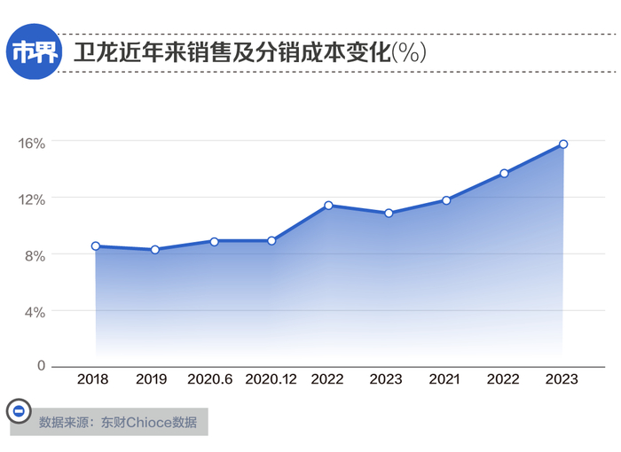 此外,随着卫龙毛利率的不断提高,目前也已超过不少“同僚”。东财Choice数据显示,今年上半年,常见的几类食品饮料板块中,啤酒与软饮料的行业平均毛利率,均在35%左右,伊利、蒙牛主导的乳品行业为26.79%,至于包括双汇在内的肉制品行业,更是只有12%,均远低于同期卫龙的47.53%。不过,相比于不断提高的毛利率,卫龙销售净利率的表现却不突出,虽然相比于2022年等特殊时期有大幅提高,从2022年上半年的-11.49%增至最新的18.87%,但只是一种回暖。2019年与2020年,卫龙的净利率也在19%左右,而毛利率不断提高,净利率却多年未变的原因之一,是其销售费用的不断提高。2023年上半年,卫龙的销售费用为3.67亿元,同比增加36.3%,占营收的比例也从11.9%增至15.8%,提升3.9个百分点。其中,卫龙用于推广及广告的费用为8988万元,同比暴涨145.7%,远超该板块的整体增幅。对比2018年8.5%的销售费用率,至今已接近翻倍状态。