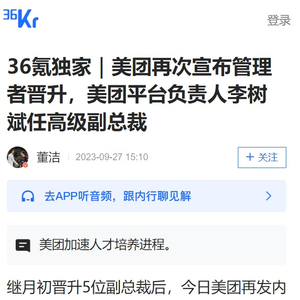 9月27日消息,据36氪,继月初晋升5位副总裁后,今日美团再发内部信,宣布任命美团平台负责人李树斌为高级副总裁(SVP),以上决定经美团最高决策机构S-team充分讨论、并由CEO王兴最终决策。