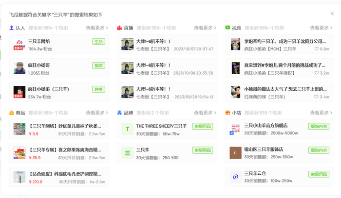 这些还都是以“三只羊”为名称的账号,在第三方数据平台,以“三只羊”为关键字搜索,达人和商品数量均上千。