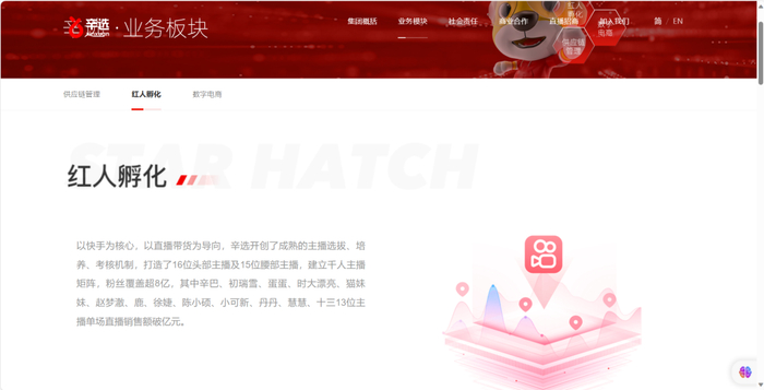 “红人孵化”版块显示,以快手为核心,以直播带货为导向,辛选开创了成熟的主播选拔、培养、考核机制,打造了16位头部主播及15位腰部主播,建立千人主播矩阵,粉丝覆盖超8亿。