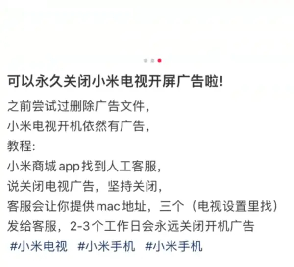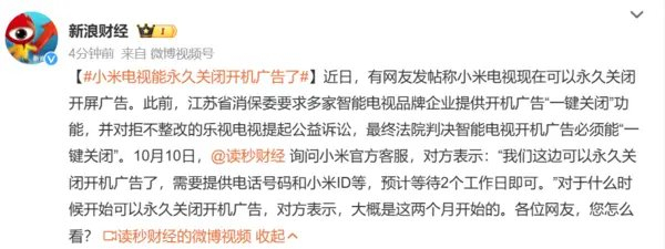 小米电视可永久关闭广告了!找小米客服,2工作日生效