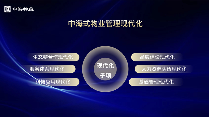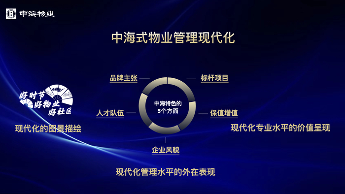 基于5个基础内涵和3类评价对象,中海物业将现代化与自身特色实践相结合,提出了“中海式物业管理现代化”,并补充增加了5个方面:品牌主张、标杆项目、保值增值、人才队伍、企业风貌。“好时节 好物业 好社区”既是我们的品牌主张,也是现代化的图景描绘;标杆项目和保值增值,是现代化专业水平的价值呈现;人才队伍和企业风貌,是现代化管理水平的外在表现。