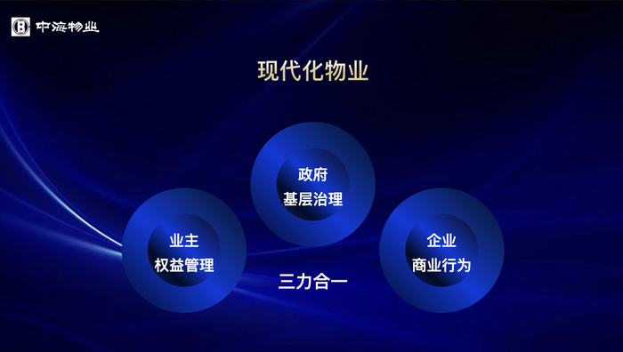 行业发展新阶段,物业要从小区走向城市,从社区服务走向基层治理,从劳动密集走向智慧物业,本质是要从传统物业服务向现代化物业转变。现代化物业就是要将政府的基层治理、业主的权益管理、企业的商业行为,三力合一。