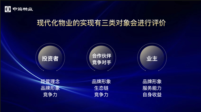 现代化物业的实现有三类对象会进行评价:投资者、合作伙伴/竞争对手、业主。对于投资者而言,更加关注的是经营理念、品牌形象和竞争力;对于合作伙伴/竞争对手而言,更加关注的是品牌形象、生态链和竞争力;对于业主而言,更加关注的是品牌形象、服务能力和自身收益。