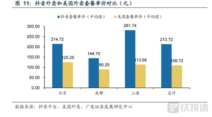 广发证券发展研究中心在报告中对比了抖音和美团在上海、北京、成都三座城市的外卖单价,抖音外卖套餐平均客单价均远高于美团外卖。