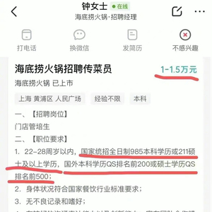 网传截图显示,海底捞火锅招聘传菜员,位置在上海黄浦区,薪酬为1万-1.5万元,要求国家统招全日制985本科学历或211硕士及以上学历。国外本科学历QS排名前200或硕士学历QS排名前500。