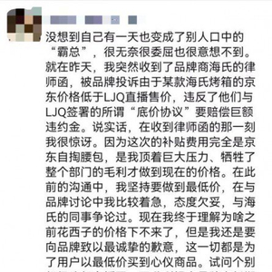 10月24日,京东采销人员在朋友圈发文称,京东收到了品牌商海氏的律师函,被品牌投诉由于某款海氏烤箱的京东价格低于李佳琦直播间售价,违反了他们与李佳琦签署的“底价协议”。