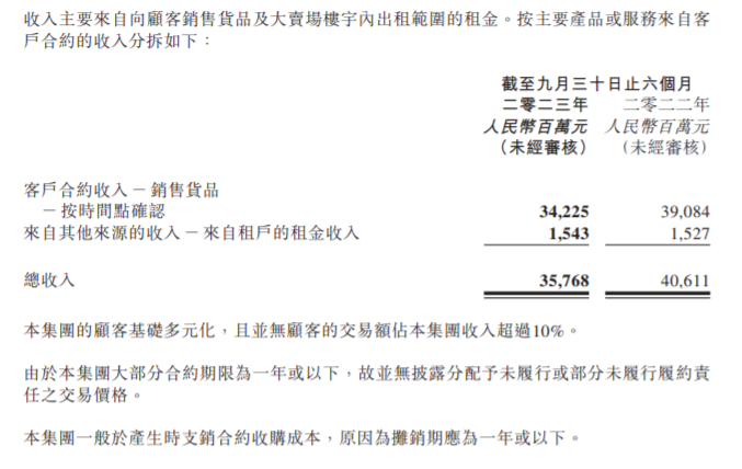 从收入结构来看,报告期内,该集团来自销售货品的收入为人民币342.25亿元,较2022年同期(390.84亿元)减少48.59亿,降幅12.4%;佣金收入所得为人民币15.43亿元,较去年同期增加0.16亿元,增幅1%。