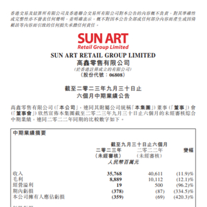 11月14日,高鑫零售发布截至9月30日的2024财年中期业绩报告。报告期内,高鑫零售营收357.68亿元,同比下滑11.9%;录得亏损3.78亿元,去年同期为亏损0.89亿元;毛利率为24.9%,与去年同期持平。