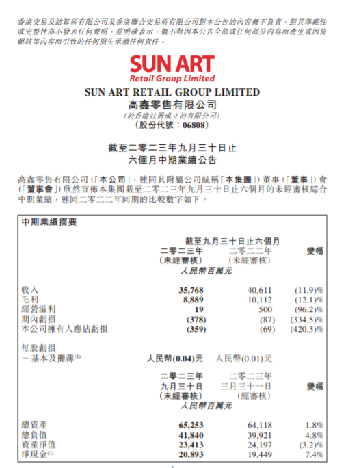 大润发母公司高鑫零售发布半年报。