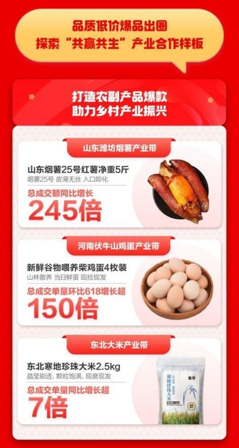 京东11.11期间,惠寻携手山东潍坊产业带打造的高山沙地烟薯,总成交额同比增长245倍;来自河南伏牛山的惠寻柴鸡蛋,总成交单量环比618增长超150倍;从惠寻自有种植基地直达消费者餐桌的东北优质寒地珍珠米,总成交单量同比增长超7倍……