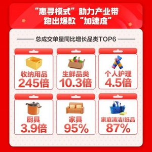 作为京东自有品牌,主打低价下沉市场的惠寻再次实现爆发增长。期间,惠寻总成交单量同比增长超250%,收纳用品、 生鲜、个人护理类产品分别增长245倍、10.3倍、4.5倍,厨具、家具、家庭清洁/纸品同样增长迅猛。