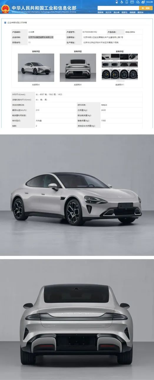 官网显示,小米汽车目前已注册两款车型,分别代号为“SU7 Max和SU 7”,现已经公布轿跑外观长宽高分别为4997mm、1963mm、1440mm,总重量为2655kg,车尾有“北京小米”字样。