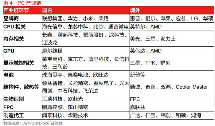 东方证券分析师蒯剑、李庭旭、韩潇锐10月25日研报认为,AI有望重塑PC市场,拉动PC需求,同时操作系统更迭与PC换机周期作用相叠加共同推动PC市场复苏,PC产业链公司有望从中受益。建议关注品牌商:联想集团;CPU相关公司:海光信息、龙芯中科;内存相关公司:澜起科技、聚辰股份、深科技、江波龙;触控显示相关公司:莱宝高科、京东方A、长信科技;电池:珠海冠宇、德赛电池、欣旺达;结构件、散热等:领益智造、长盈精密、光大同创、英力股份、中石科技、飞荣达;生物识别:汇顶科技、欧菲光;FPC:鹏鼎控股、东山精密;制造代工:华勤技术、闻泰科技等。
