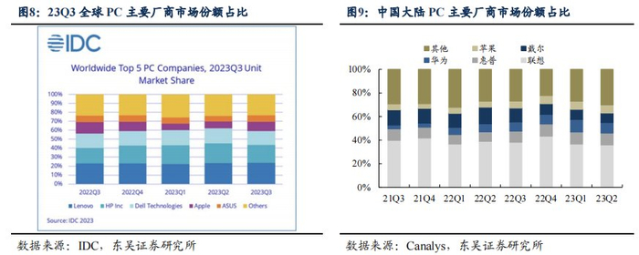东吴证券分析师马天翼、鲍娴颖10月29日研报指出,PC产业链由上游组件、中游组装和下游品牌厂商三部分构成:上游组件的核心是CPU和以连接器为代表的精密结构件。中游组装以ODM为主,集中度高,广达、仁宝、纬创、英伟达四大代工厂出货量接近全球PC出货量50%。下游品牌厂商竞争加剧,联想份额稳居第一,华为份额提升快速。