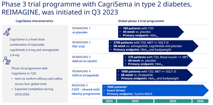 诺和诺德围绕CagriSema在二型糖尿病、减重适应症都开展了多项三期临床。