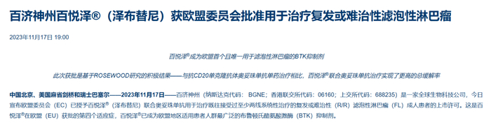 除R/R FL外,泽布替尼目前已在欧盟获批作为单药治疗慢性淋巴细胞白血病(CLL)成人患者;作为单药治疗既往接受过至少一种抗CD20疗法的边缘区淋巴瘤(MZL)成人患者;以及用于治疗既往接受过至少一种治疗的华氏巨球蛋白血症(WM)成人患者,或用于不适合接受化疗免疫治疗的WM患者的一线治疗。据悉,百济神州已向美国和中国的药监机构提交了泽布替尼用于治疗R/R FL的注册申报资料,目前正在审评中。