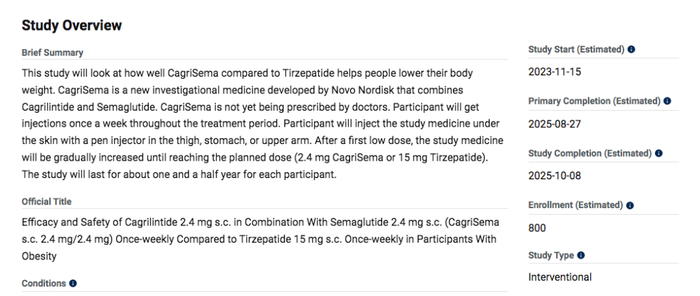 近日,诺和诺德在Clinicaltrials.gov网站上注册了CagriSema与替尔泊肽头对头对照用于减肥的三期临床试验。