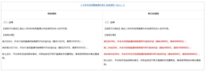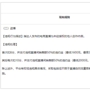 调整后,盗播的违规处理为:首次扣10分,并支付违规直播间销售额50%的违约金(最低2000元,最高50000元);第二次扣20分,并支付违规直播间销售额100%的违约金(最低4000元,最高100000元);其后每次扣30分,并支付并支付违规直播间销售额100%的违约金(最低6000元,最高200000元)。除上述外,平台有权视违规具体情况,采取包括但不限于直播自然流量限制、暂停使用购物车等处置措施。