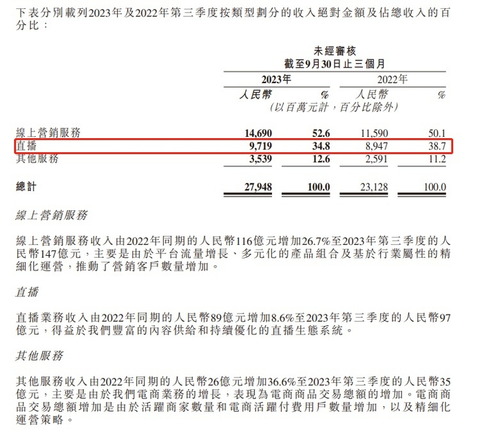 三季度快手直播业务收入同比增长8.6%至97亿元
