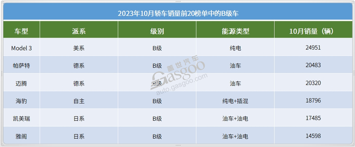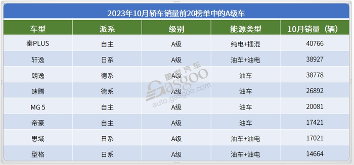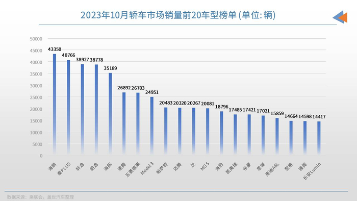 2023年10月轿车销量TOP20:8款新能源车上榜,比亚迪占据5席