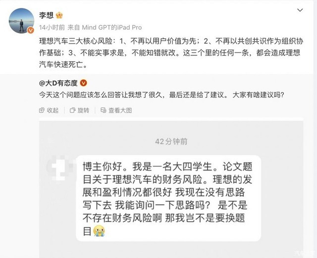近日,有网友向理想汽车创始人李想咨询公司财务风险问题。李想在回复中表示,理想汽车面临着三大核心风险:不再以用户价值为先、不再以共创共识作为组织协作基础、不能实事求是,不能知错就改。他指出,任何一条都可能导致理想汽车的快速死亡。