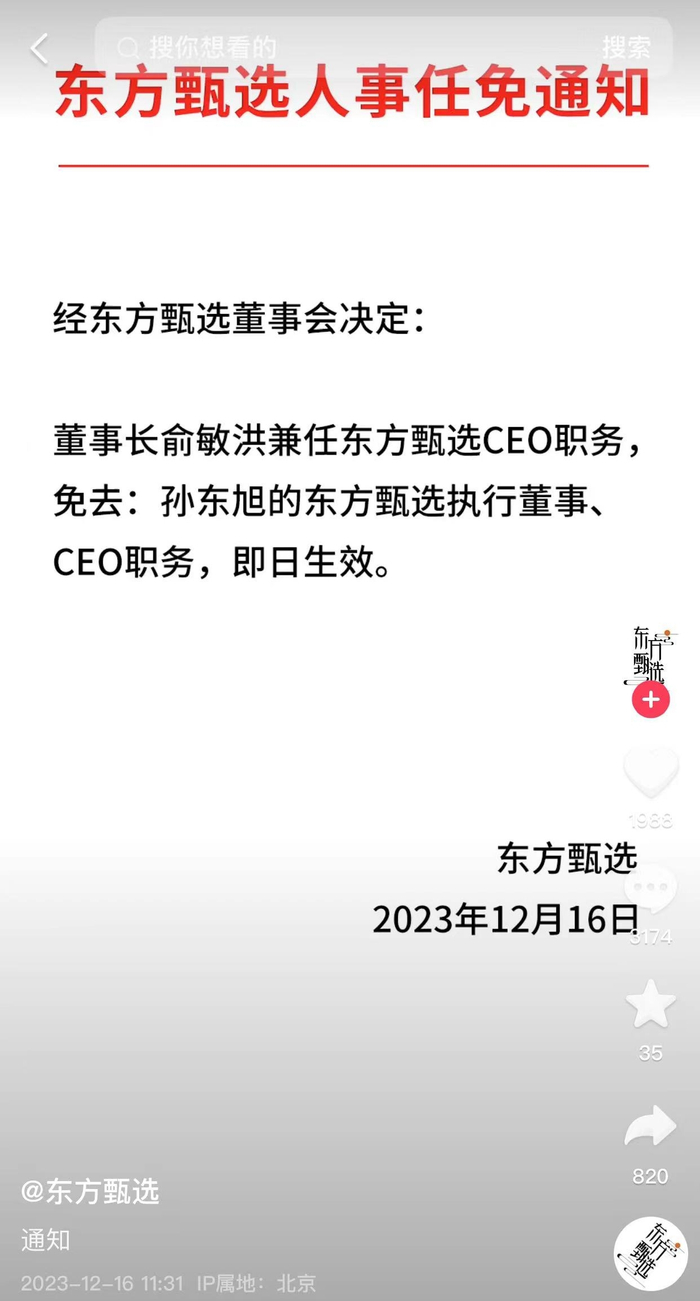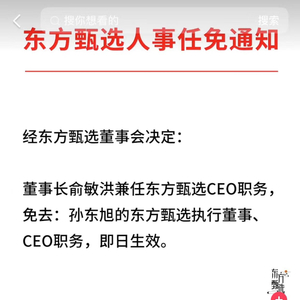 12月16日中午,东方甄选抖音账号发布最新人事任免通知。经东方甄选董事会决定:董事长俞敏洪兼任东方甄选CEO职务,免去孙东旭东方甄选执行董事、CEO职务,即日生效。