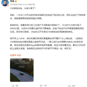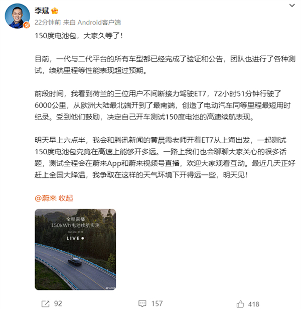 近日,蔚来汽车创始人、CEO李斌在微博上发布了一则消息。他透露,蔚来汽车已经完成了搭载150度电池的车型的验证和公告,并且团队进行了各种测试,续航里程等性能表现超过预期。为了进一步测试这款电池包的高速续航能力,李斌将与腾讯新闻的黄晨霞老师于明天早上六点半一起驾车前往上海,在蔚来App和蔚来视频号进行直播。