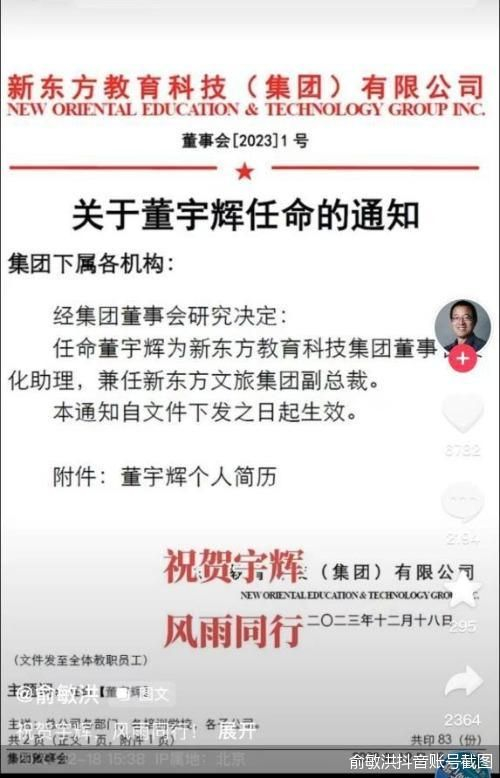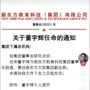 与之前不同,此次重回直播间的董宇辉身上有了高级合伙人和副总裁的职级身份。12月17日深夜,东方甄选发布直播预告,在预告海报上,董宇辉的介绍变为“东方甄选高级合伙人”。12月18日下午,俞敏洪在其个人抖音账号发布公告,称经集团董事会研究决定,任命董宇辉为新东方教育科技集团董事长文化助理,兼任新东方文旅集团副总裁。