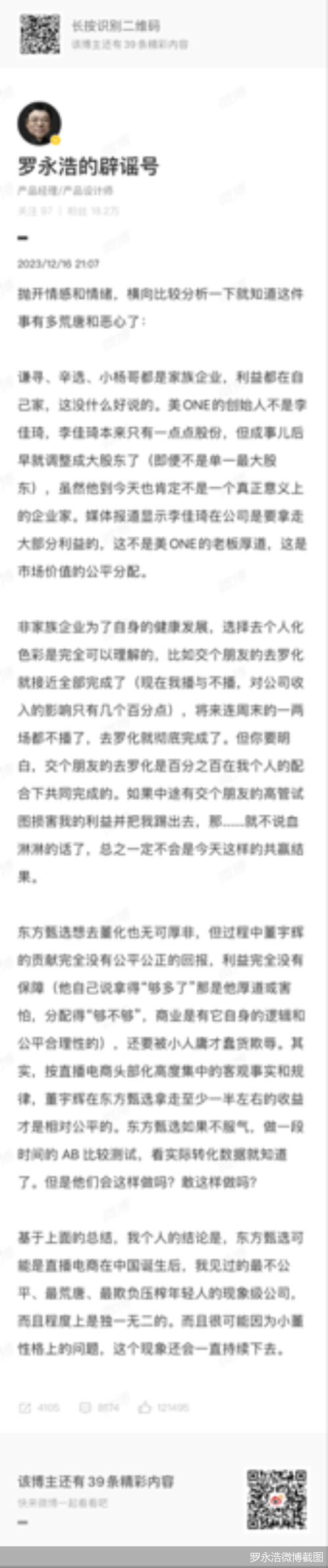 持续关注此事的罗永浩则在12月16日微博发文称,按直播电商头部化高度集中的客观事实和规律,董宇辉在东方甄选拿走至少一半左右的收益才是相对公平的。