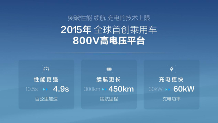 比亚迪率在 2015 年全球首创了乘用车 800 V 高电压平台,搭载在秦 EV(2015 款)、唐 DM(2015 款)等车型上。