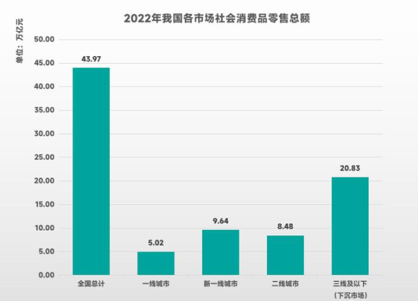 据公开数据显示,2022年全国社会消费品零售总额43.97万亿元。其中,一线城市为5.02万亿元,占比11.4%;新一线城市为9.64万亿元,占比21.9%;二线城市为8.48万亿元,占比19.3%;下沉市场达20.83万亿元,占比47.4%。随着三线及以下城市消费意识和基础建设的不断提升,下沉市场在未来有望迸发出更大的潜力。